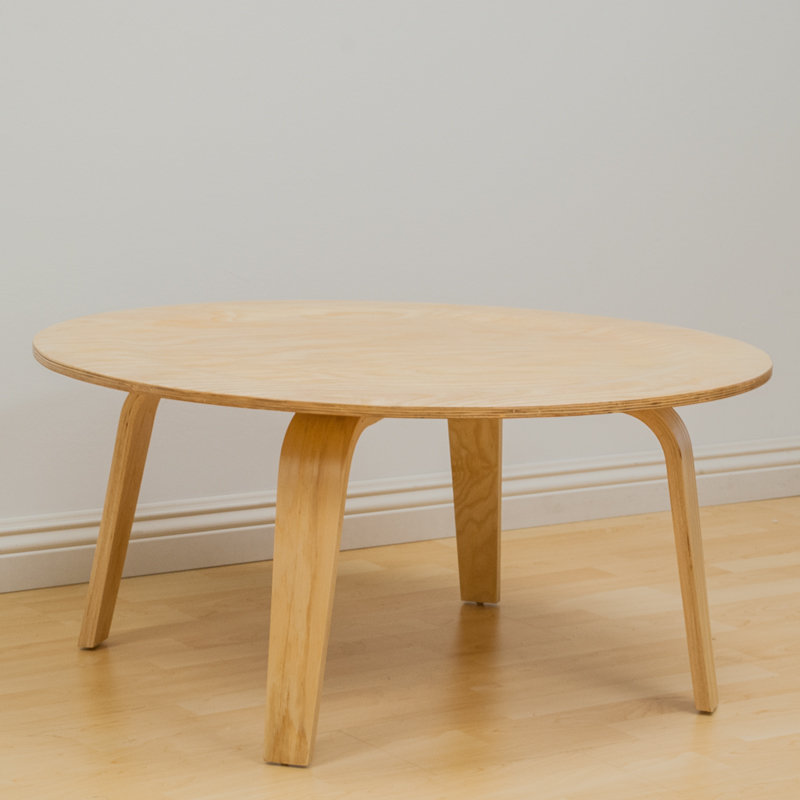 Coffee table featuring pair of curved sides, round starburst top, and shelf.